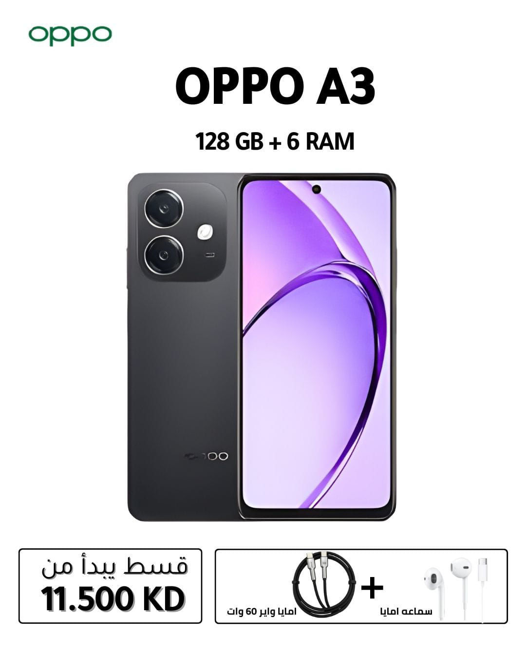 هاتفك هو Oppo A3 بسعة 128 جيجابايت، وهو هاتف يقدم مواصفات جيدة للاستخدام اليومي مع تصميم أنيق، ويأتي عادةً مع ذاكرة وصول عشوائي (RAM) 6 جيجابايت وتخزين داخلي 128 جيجابايت، مدعوم بمعالج Snapdragon 6s Gen 1 (أو MediaTek Dimensity 6300 في بعض الإصدارات)، وشاشة بمعدل تحديث عالٍ، بطارية كبيرة (5100mAh) تدعم الشحن السريع (45W)، وكاميرا رئيسية 50 ميجابكسل، ويعمل بنظام ColorOS المبني على أندرويد 14.