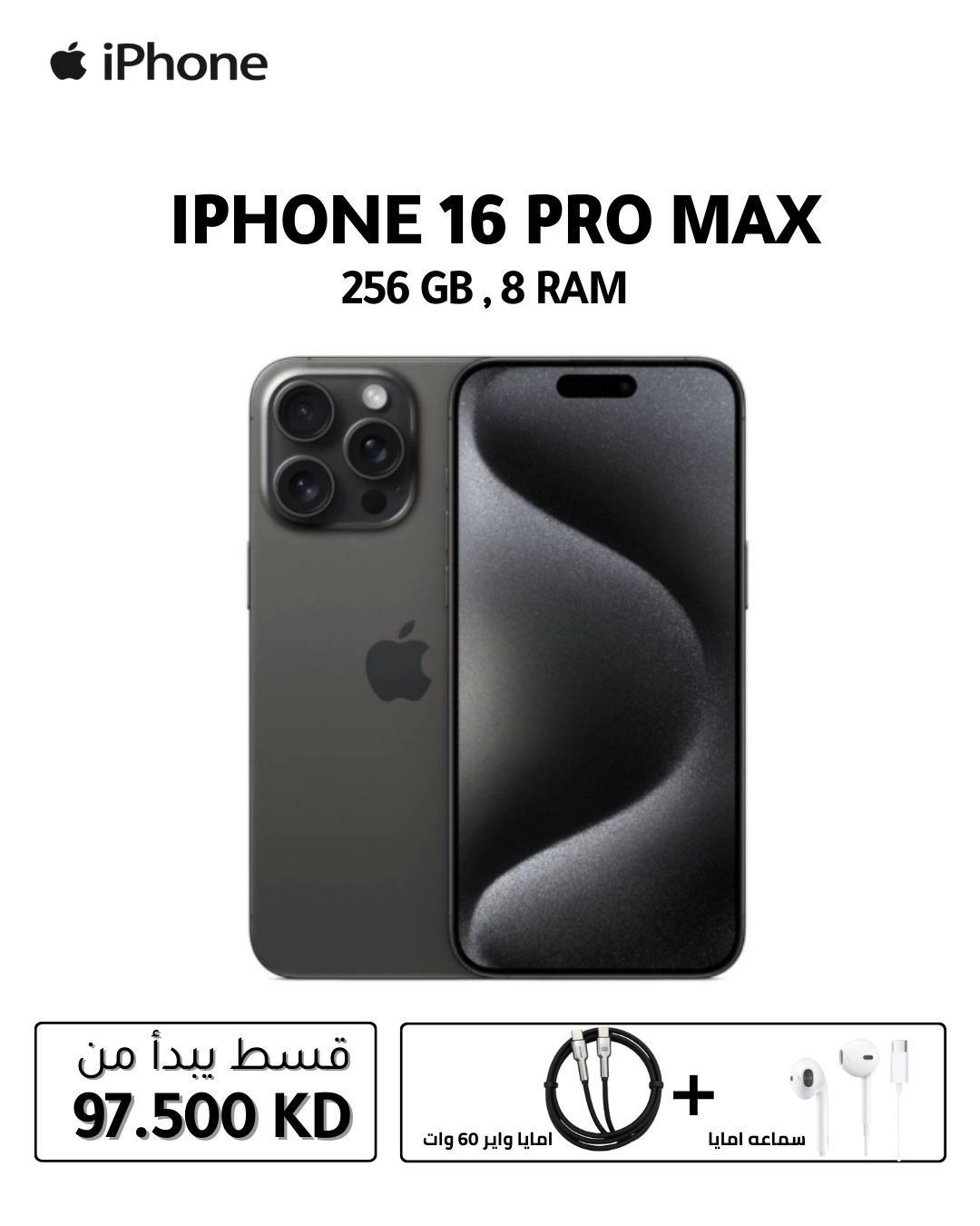 هاتف iPhone 16 Pro Max 256GB يأتي بشاشة Super Retina XDR مقاس 6.9 بوصة، ومعالج A18 Pro القوي، ونظام كاميرات ثلاثي متطور (48MP رئيسية + 48MP واسعة جدًا + 12MP تليفوتو 5x)، مع ذاكرة وصول عشوائي 8 جيجابايت وتخزين 256 جيجابايت، ونظام iOS 18، وشحن لاسلكي، وتصميم من التيتانيوم، ودعم Apple Intelligence