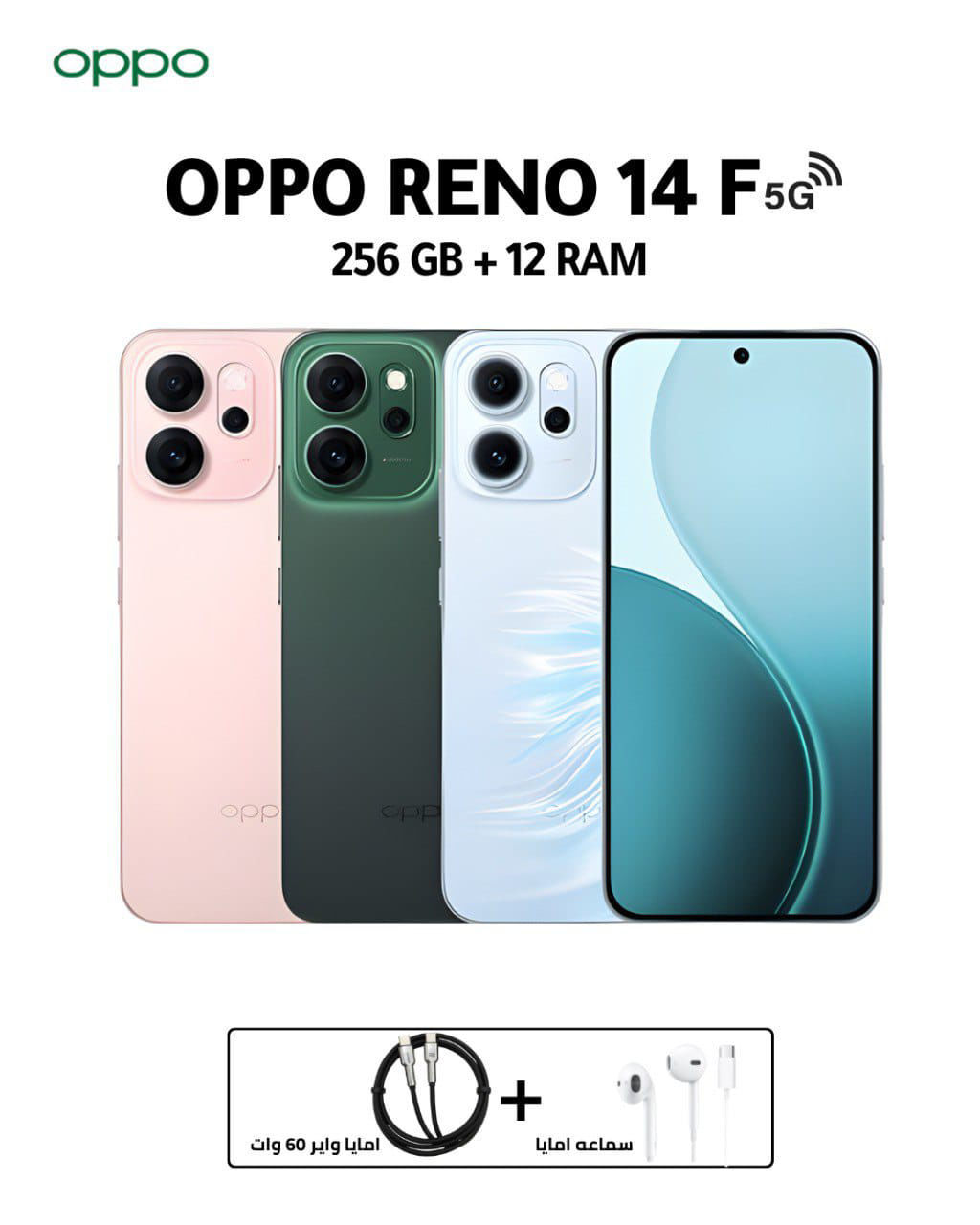 هاتفك هو Oppo Reno 14F 5G، ويأتي بمواصفات قوية تشمل ذاكرة تخزين 256 جيجابايت، وذاكرة وصول عشوائي (RAM) بسعة 12 جيجابايت (في النسخة القياسية)، وشاشة AMOLED بتردد 120Hz وسطوع عالي، ومعالج Snapdragon 6 Gen 1 يدعم شبكات الجيل الخامس، وكاميرا خلفية ثلاثية رئيسية 50 ميجابكسل مع مثبت بصري OIS، وبطارية ضخمة 6000 مللي أمبير مع شحن سريع 80 واط، ونظام تشغيل Android 15 مع واجهة ColorOS 15