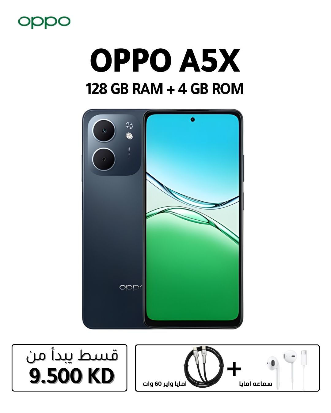 هاتف Oppo A5x بذاكرة 128 جيجابايت و 4 جيجابايت رام هو هاتف من الفئة المتوسطة يتميز بشاشة كبيرة (حوالي 6.67 بوصة)، معالج Snapdragon 6s Gen1، كاميرا رئيسية 32 ميجابكسل، بطارية كبيرة (6000 مللي أمبير)، ويدعم الشحن السريع 45 واط، ويعمل بنظام تشغيل أندرويد مع واجهة ColorOS