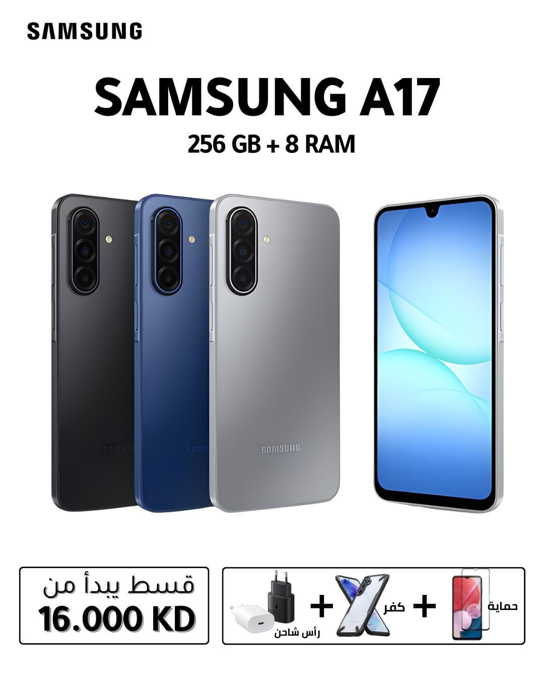 هاتف Samsung Galaxy A17 بمواصفات 8 جيجابايت رام و 256 جيجابايت تخزين هو هاتف من الفئة المتوسطة يقدم شاشة Super AMOLED واسعة (6.7 بوصة، 90Hz)، كاميرا رئيسية 50MP (مع OIS في بعض الإصدارات)، معالج ثماني النواة (Helio G99)، بطارية 5000mAh تدعم الشحن السريع، ويأتي مع دعم لـ 6 أجيال من تحديثات نظام التشغيل (Android 15) و 6 سنوات تحديثات أمنية